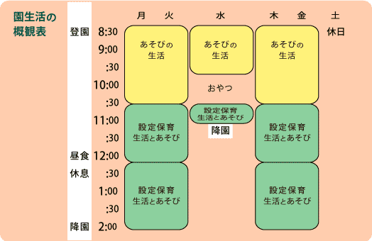 ※月・木は給食、水はおやつ(午前保育11:00降園)、火・金はお弁当になります。